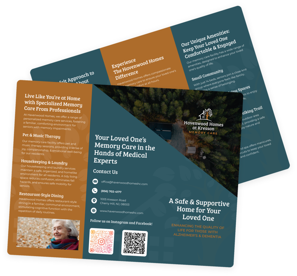 If your loved one struggles with independent living due to Alzheimer’s disease or dementia complications, Havenwood Homes can provide the personalized memory care they need. Our homelike memory care assisted living facility in Camden County is a safe haven for seniors facing memory impairments, offering individualized support, engaging activities, and serene natural surroundings to enhance daily living.